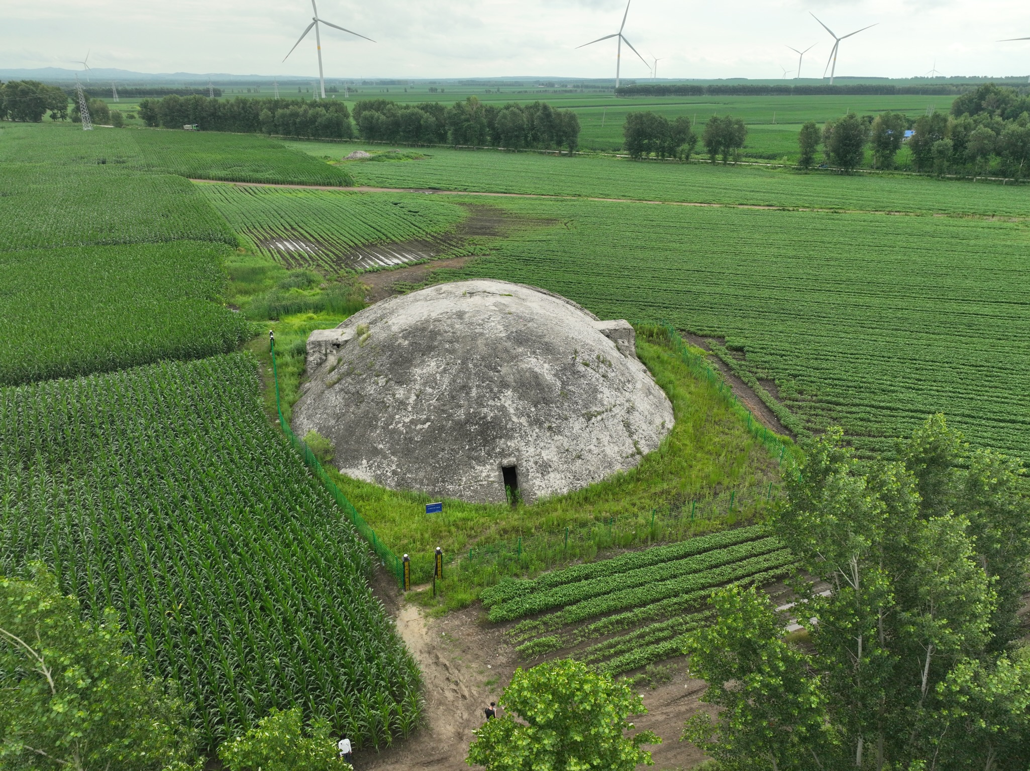 向土龍山鎮(zhèn)東行約1.5公里,一座形似巨大頭盔的混凝土建筑突兀地蟄伏于曠野——這便是“土龍東門外飛機(jī)堡”遺址。它是當(dāng)年日本為侵略擴(kuò)張所建龐大機(jī)場網(wǎng)絡(luò)中僅存完整的飛機(jī)庫,直徑逾10米,墻體厚達(dá)60厘米,冷硬地矗立了八十余載。
